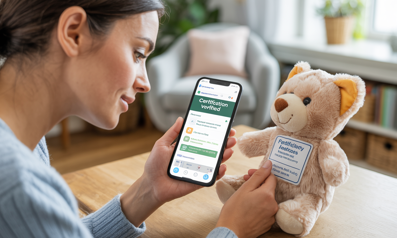 제품 구매 전 안전 라벨을 확인하고 스마트폰으로 인증 정보를 검증하는 부모의 모습입니다. 리콜 정보와 유해물질 검출 이력을 사전에 확인하는 것이 중요합니다.