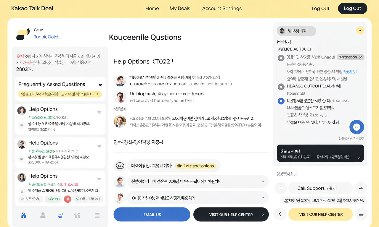 전화 상담은 1577-0000(가상 번호)을 통해 가능하며, 운영 시간은 평일 오전 9시부터 오후 6시까지입니다(공휴일 제외). 이메일 문의는 help@kakaotalkdeal.co.kr로 보낼 수 있습니다. 상품별 문의 사항(재고, 상세 스펙, 사용법 등)은 해당 상품 페이지의 'Q&A' 기능을 통해 판매자에게 직접 문의하는 것이 가장 정확한 정보를 얻을 수 있는 방법입니다.