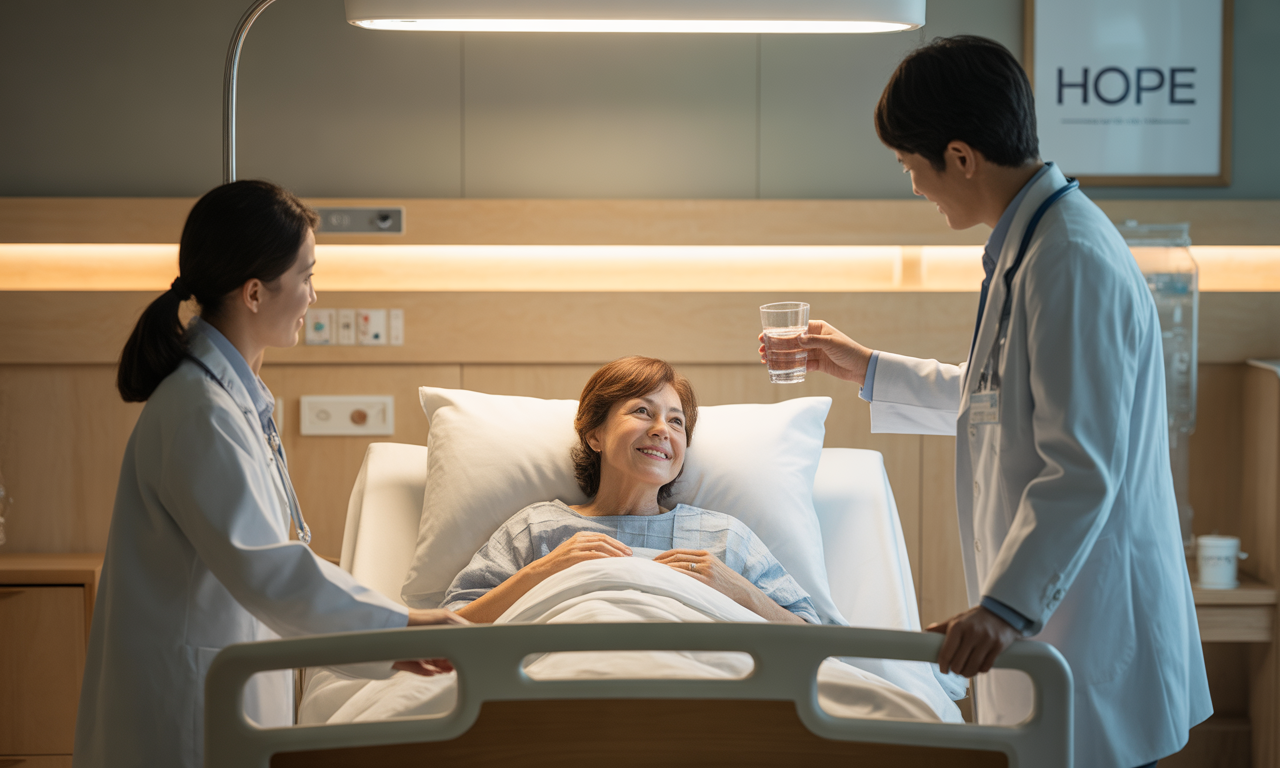 항암제 배출과 신장 기능 유지에 중요합니다. 하루 8-10컵의 수분 섭취를 목표로 하며, 물, 허브차, 묽은 수프 등 다양한 형태로 섭취할 수 있습니다.
