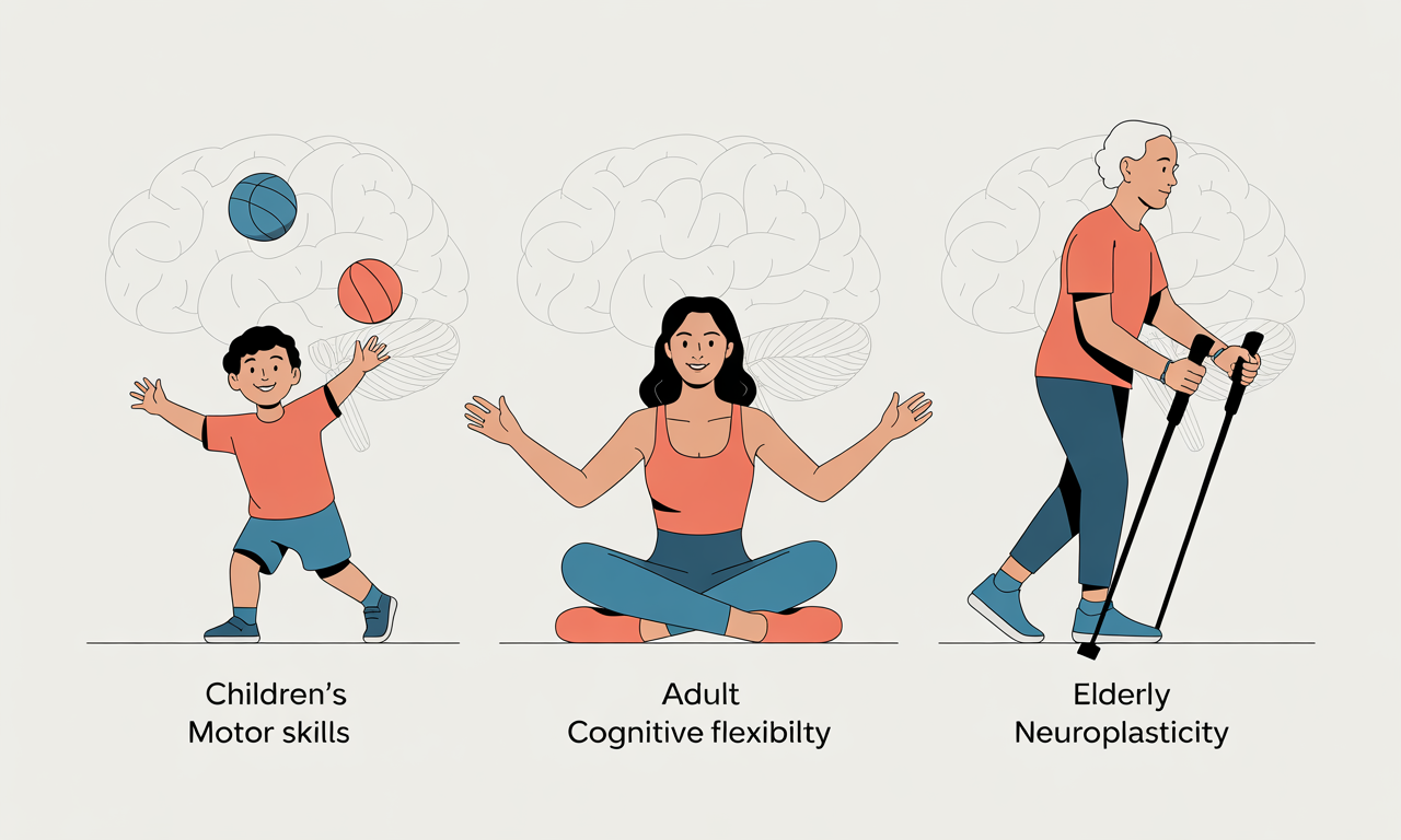 운동이 뇌 건강에 미치는 영향은 연령대와 운동 유형에 따라 다양한 패턴을 보입니다. 각 생애 단계에서의 신체 활동은 뇌 발달과 기능에 독특한 방식으로 기여합니다.