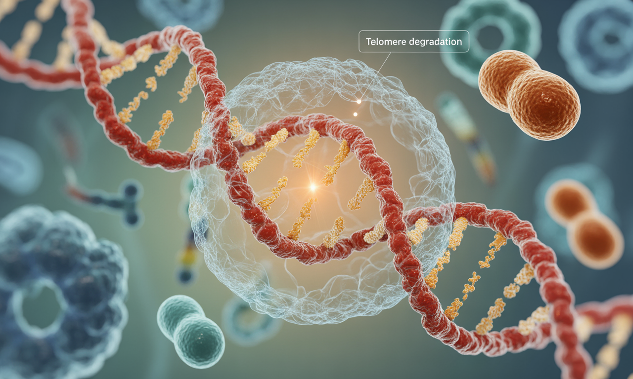 세포 수준에서 노화는 여러 복합적인 메커니즘을 통해 진행됩니다. 그 중 가장 잘 알려진 것은 텔로미어 단축 현상입니다. 텔로미어는 염색체 말단에 위치한 반복 DNA 서열로, 세포가 분열할 때마다 50-200개의 염기쌍이 손실됩니다. 이 과정이 계속되면 텔로미어 길이가 임계점 이하로 줄어들어 세포가 더 이상 분열하지 못하는 '헤이플릭 한계'에 도달하게 됩니다.