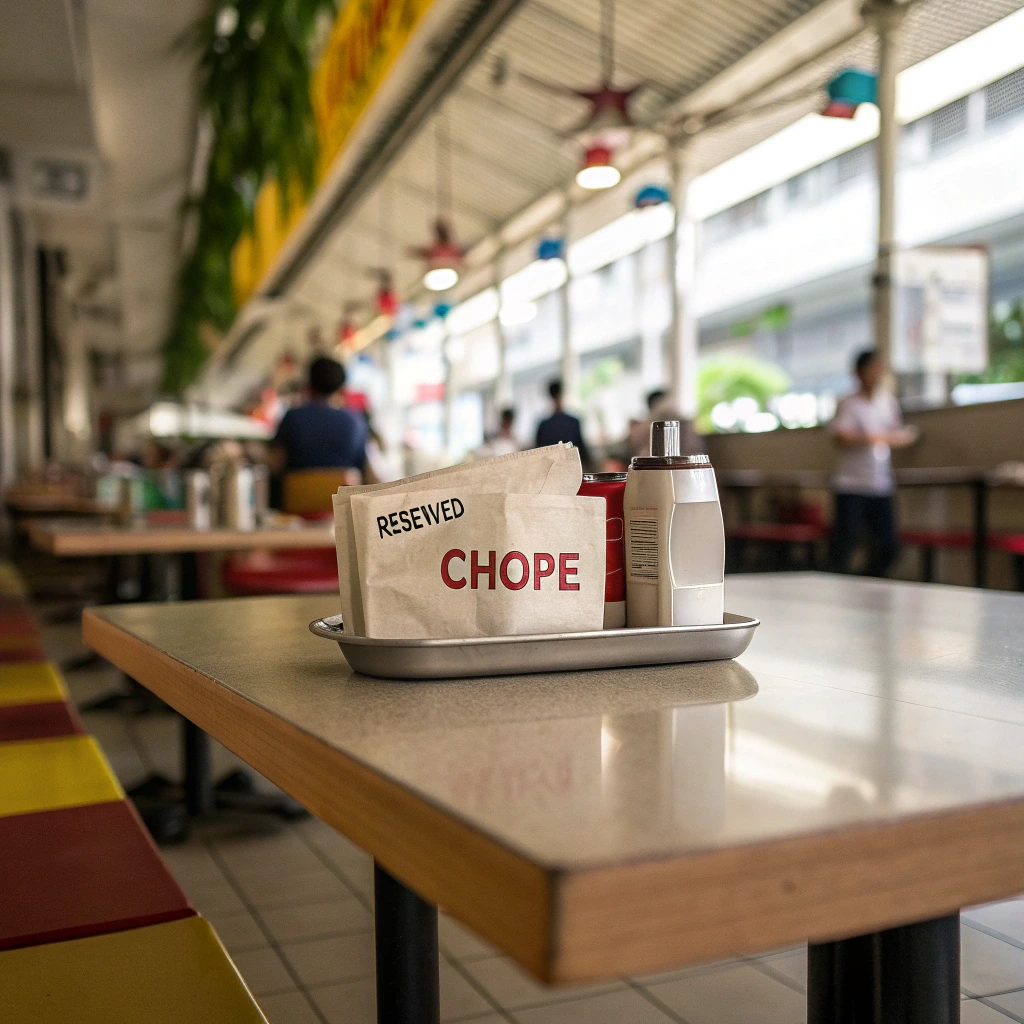 먼저 빈 테이블을 찾아 앉습니다. 싱가포르에서는 티슈 패킷을 테이블 위에 올려두는 '초핑(choping)' 문화로 자리를 예약합니다. 테이블에 티슈나 물건이 놓여 있으면 이미 예약된 자리이니 다른 곳을 찾아야 합니다. 일행 중 한 명이 자리를 지키고 다른 사람들이 음식을 주문하러 가는 것이 일반적입니다.