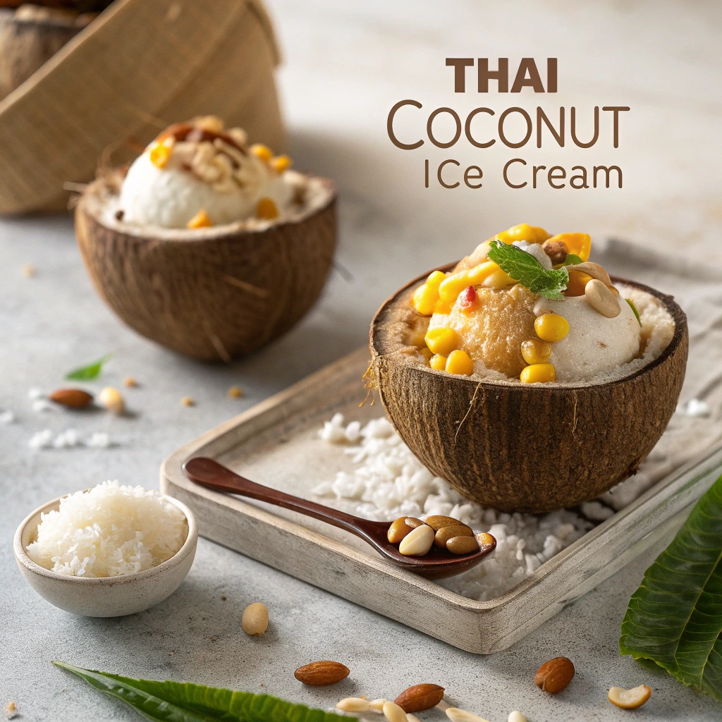 식사 후에는 코코넛 아이스크림을 꼭 드세요. 코코넛 껍질에 담아 제공되는 이 아이스크림은 코코넛 과육, 땅콩, 옥수수 등 다양한 토핑과 함께 즐길 수 있습니다. 시원하고 달콤하며, 코코넛의 자연스러운 향이 매력적입니다. 가격은 40-50바트 정도로 저렴하며, 포토제닉한 비주얼로 인스타그램 사진으로도 완벽합니다.