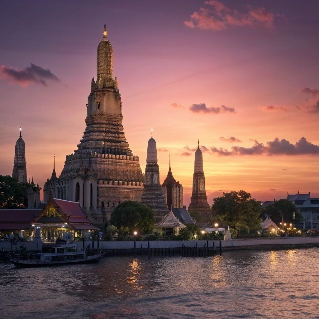 강 건너편 사원들과 고층 빌딩의 야경이 켜지면서 로맨틱한 분위기가 연출됩니다. 연인과 함께 방문하기에 최적의 시간대입니다.