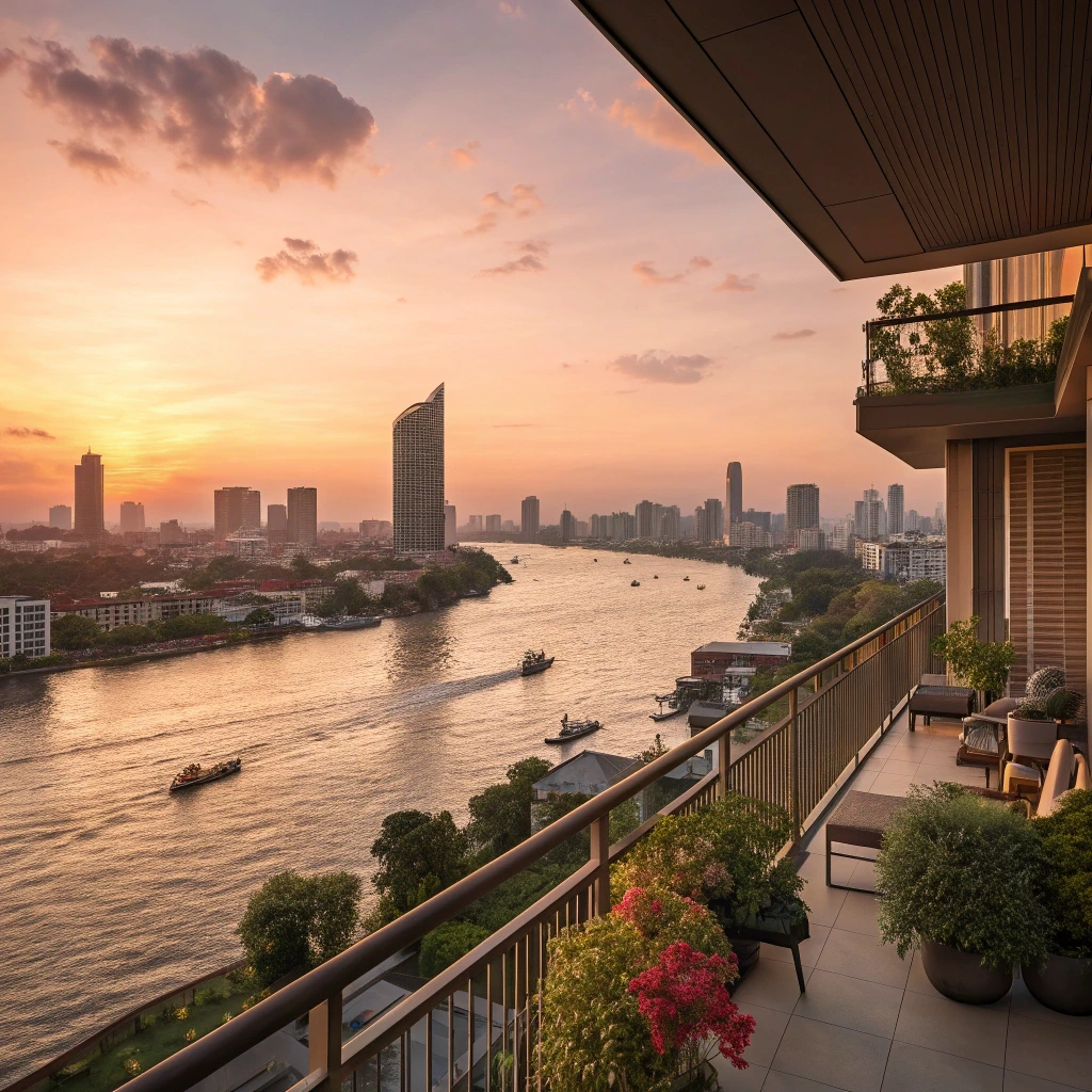 테라스에서는 강 건너편의 왓 아룬(새벽 사원)과 왕궁 지역이 한눈에 보이며, 정기적으로 오가는 크루즈 선박들의 모습도 감상할 수 있습니다. 저녁 시간에는 강변을 따라 조명이 켜지면서 더욱 화려한 야경을 선사합니다.