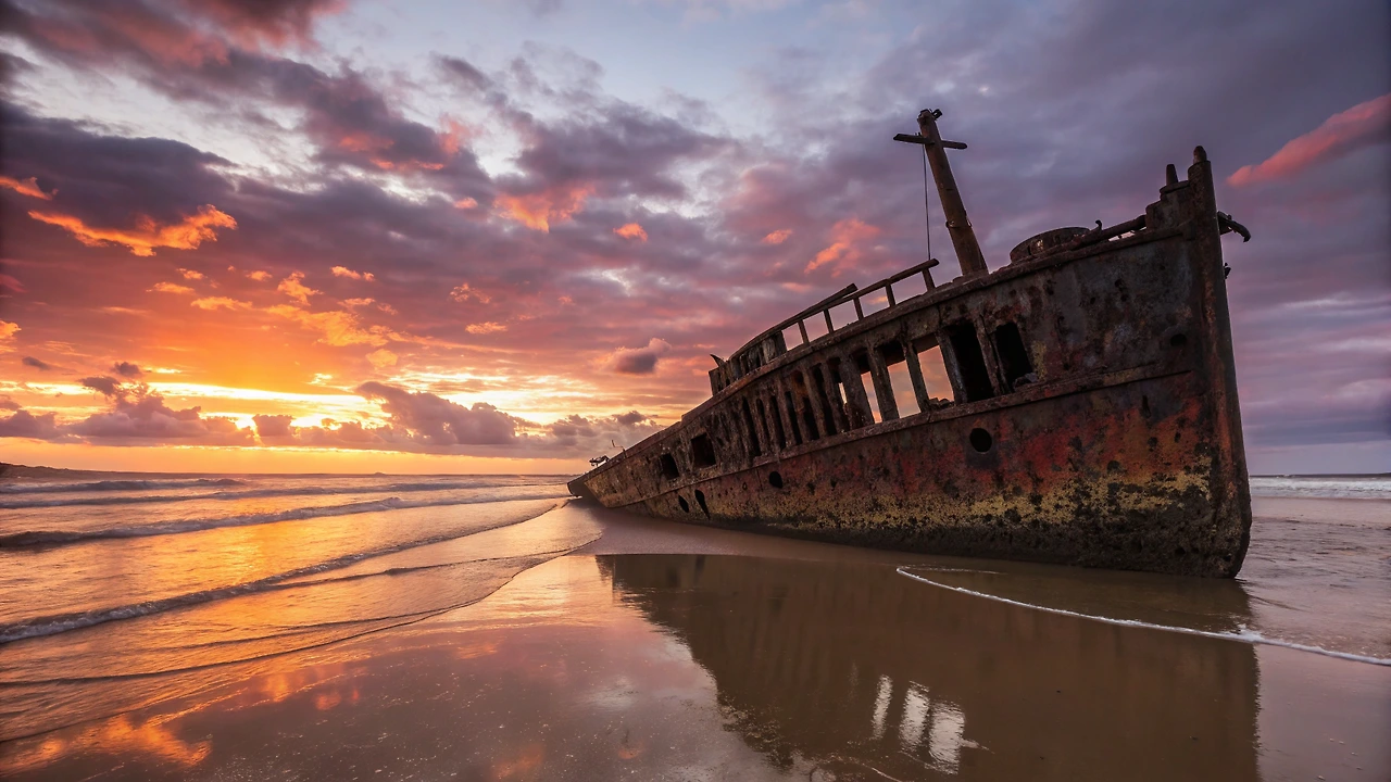 해변 위에 누운 철선의 실루엣이 황혼빛과 어우러져 압도적인 사진을 선사합니다.