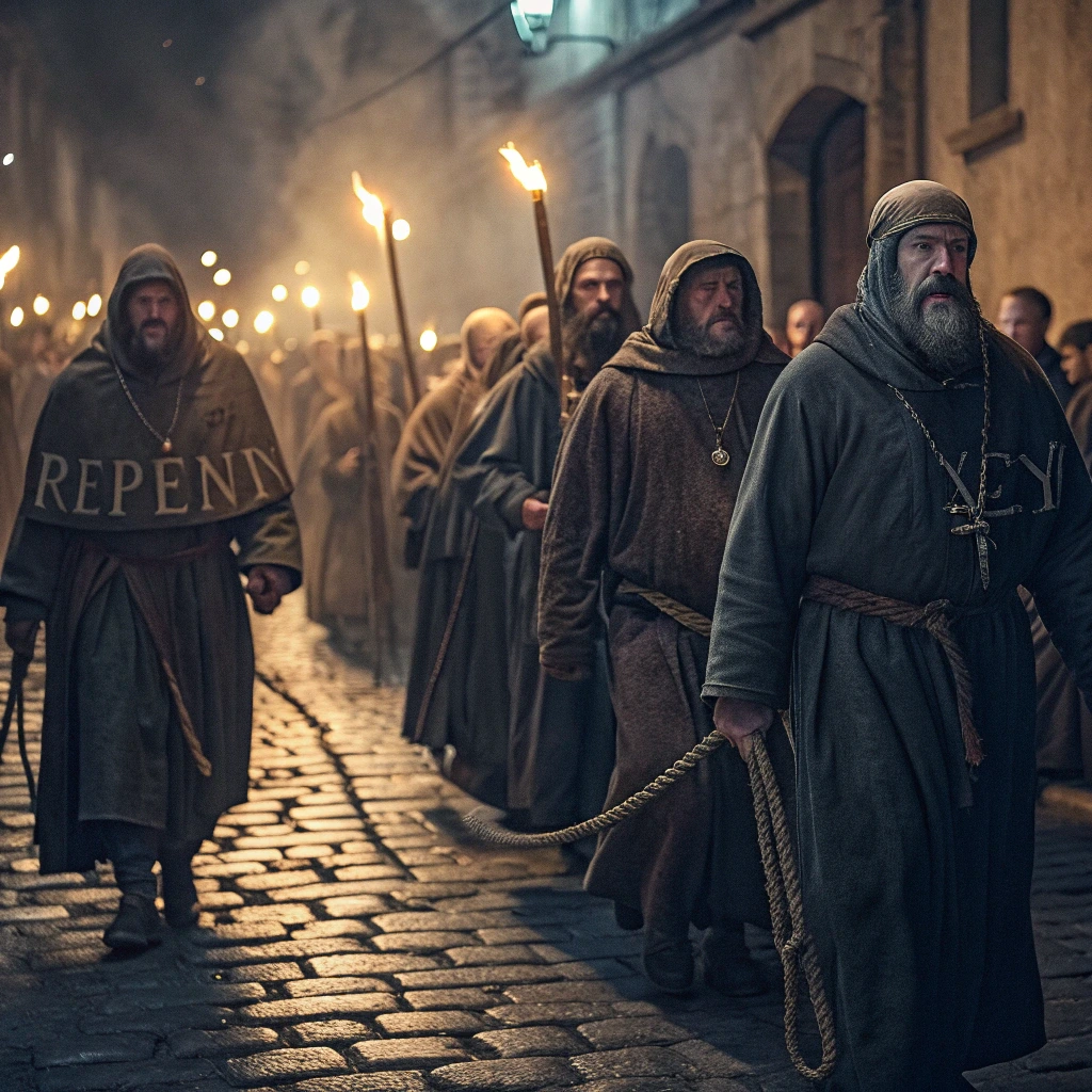 중세 유럽인들은 흑사병을 인간의 죄에 대한 신의 징벌로 해석했습니다. 이러한 믿음은 극단적인 종교적 반응을 낳았으며, 자해 고행단(Flagellants)이 유럽 전역을 돌아다니며 공개적으로 자신을 채찍질하는 모습이 흔하게 목격되었습니다.