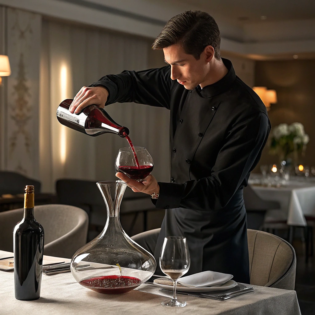 와인을 병에서 다른 용기로 옮겨 담는 과정입니다. 침전물을 제거하고 공기와의 접촉을 통해 와인의 향과 맛을 활짝 열리게 합니다.