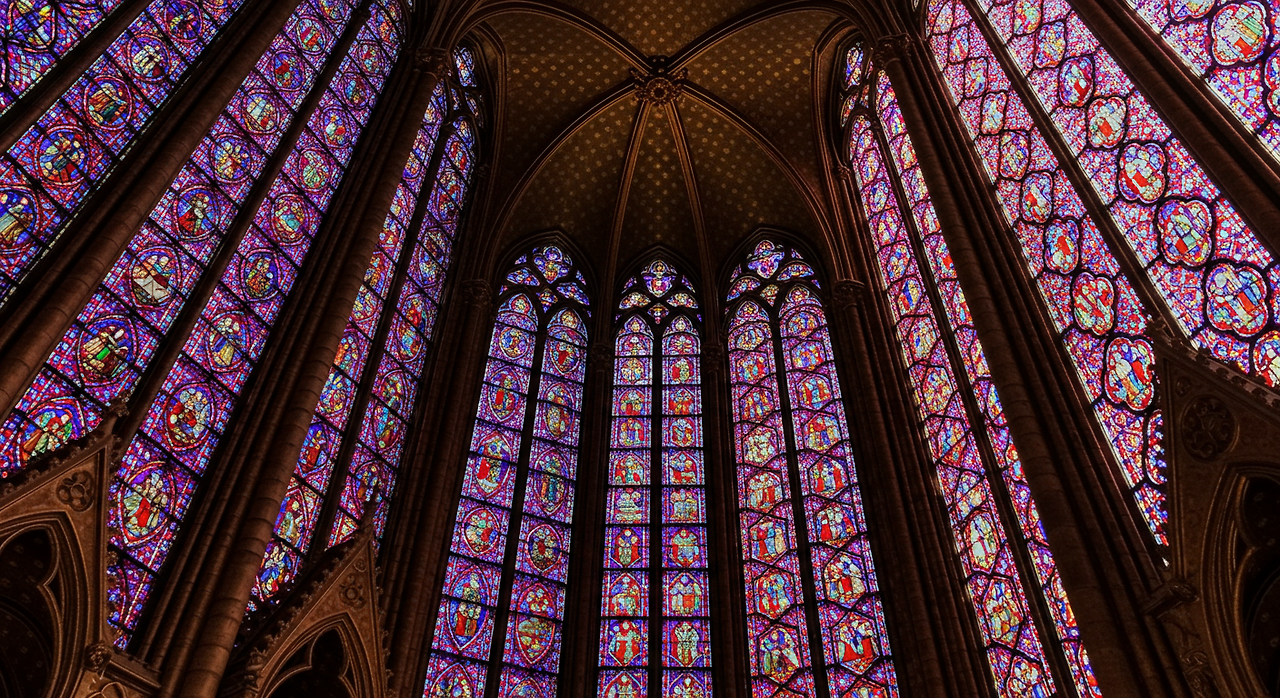 고딕 성당의 또 다른 특징은 대형 스테인드글라스 창문입니다. 구조적 지지가 주로 기둥과 버트레스에 의존하게 되면서, 벽은 더 이상 하중을 지탱할 필요가 없어졌고, 이로 인해 대형 창문을 설치할 수 있게 되었습니다. 이 창문들은 성경 이야기를 묘사한 화려한 색상의 스테인드글라스로 채워져, 내부에 신비로운 색색의 빛을 드리웠습니다. 샤르트르 대성당의 '푸른 창문'과 파리 노트르담 대성당의 장미창은 고딕 스테인드글라스의 뛰어난 예입니다.