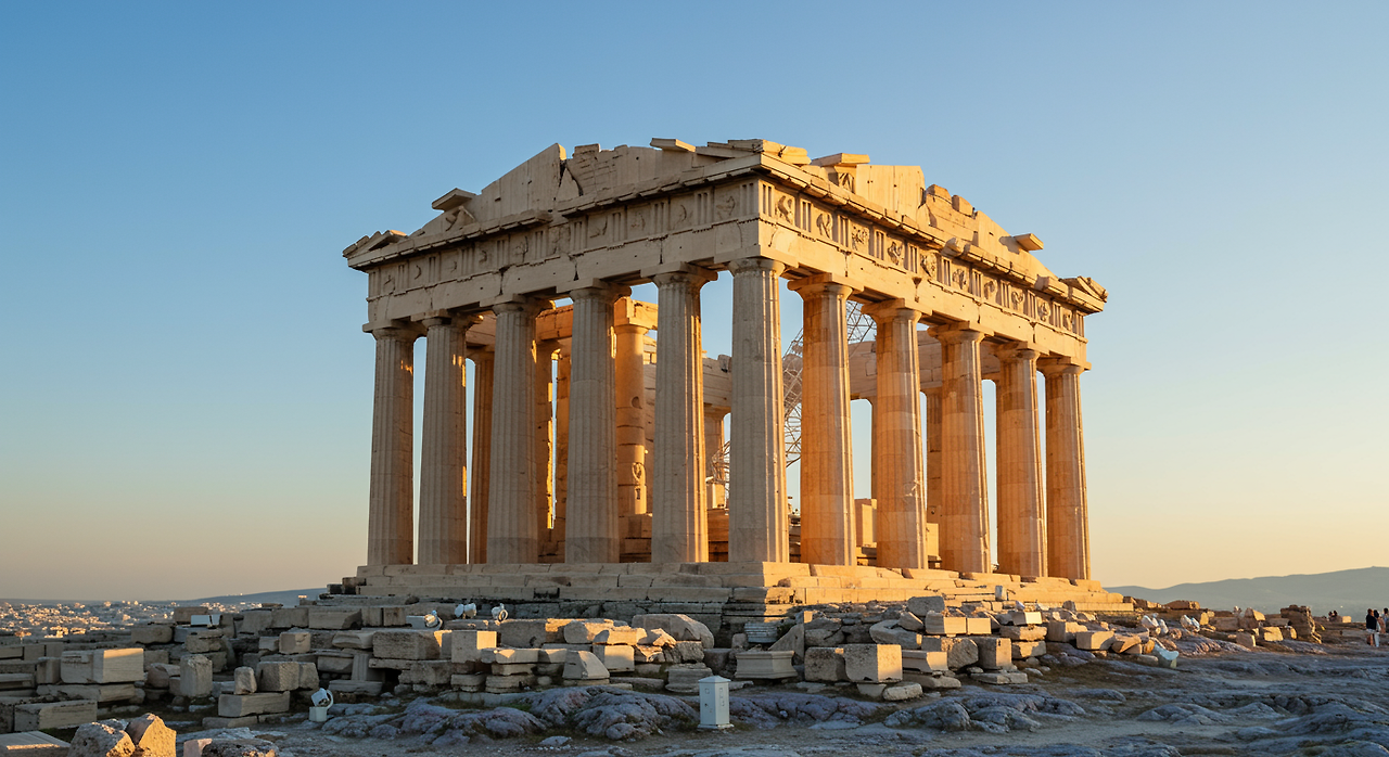 아테네의 파르테논 신전은 그리스 건축의 완성도를 보여주는 대표적인 예입니다. 도리안 양식의 이 건축물은 완벽한 비례와 미묘한 곡선을 통해 시각적 환영을 창출합니다. 엄격한 수학적 원리에 따라 설계된 파르테논 신전의 기둥들은 약간 안쪽으로 기울어져 있어, 멀리서 보았을 때 완벽하게 수직으로 보이도록 설계되었습니다. 이러한 세밀한 조정은 '엔타시스'라 불리는 기법으로, 그리스인들의 시각적 완벽성에 대한 추구를 보여줍니다.