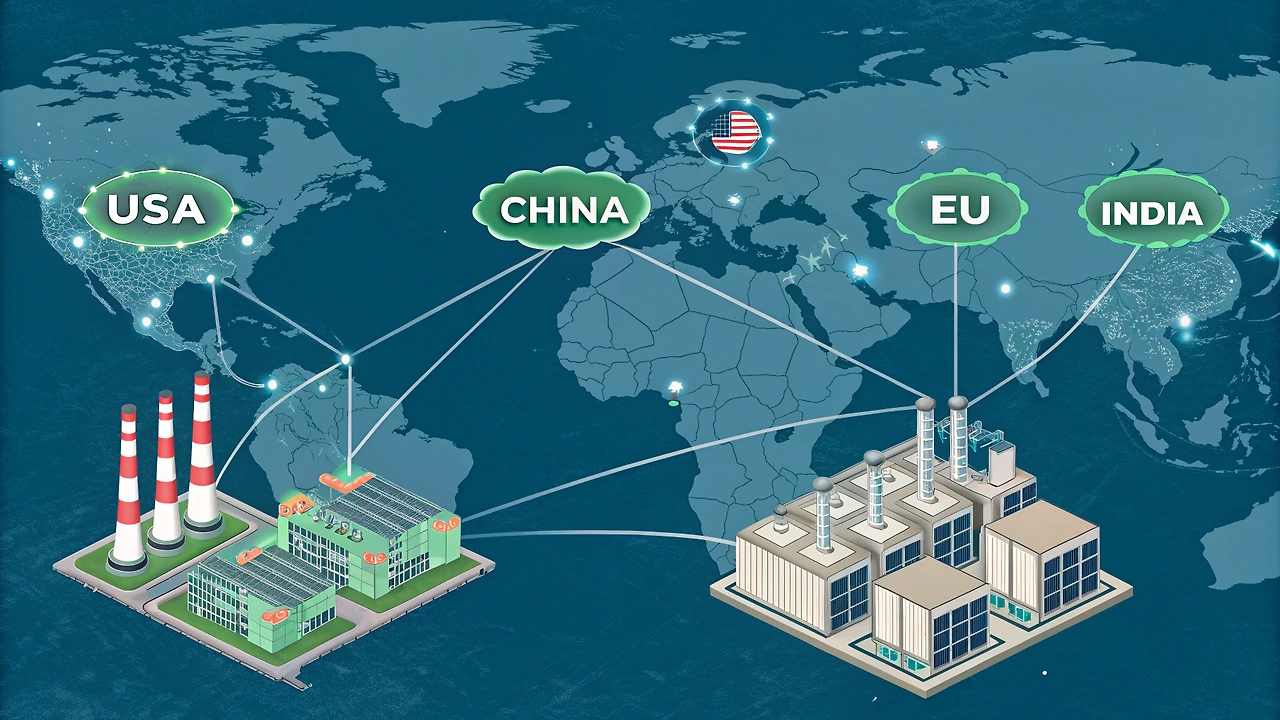 글로벌 탄소 배출권 거래 시스템과 AI 데이터센터의 관계를 보여주는 개념도. AI 기업들은 탄소 배출권 거래를 통해 환경적 책임을 이행하고 있습니다.